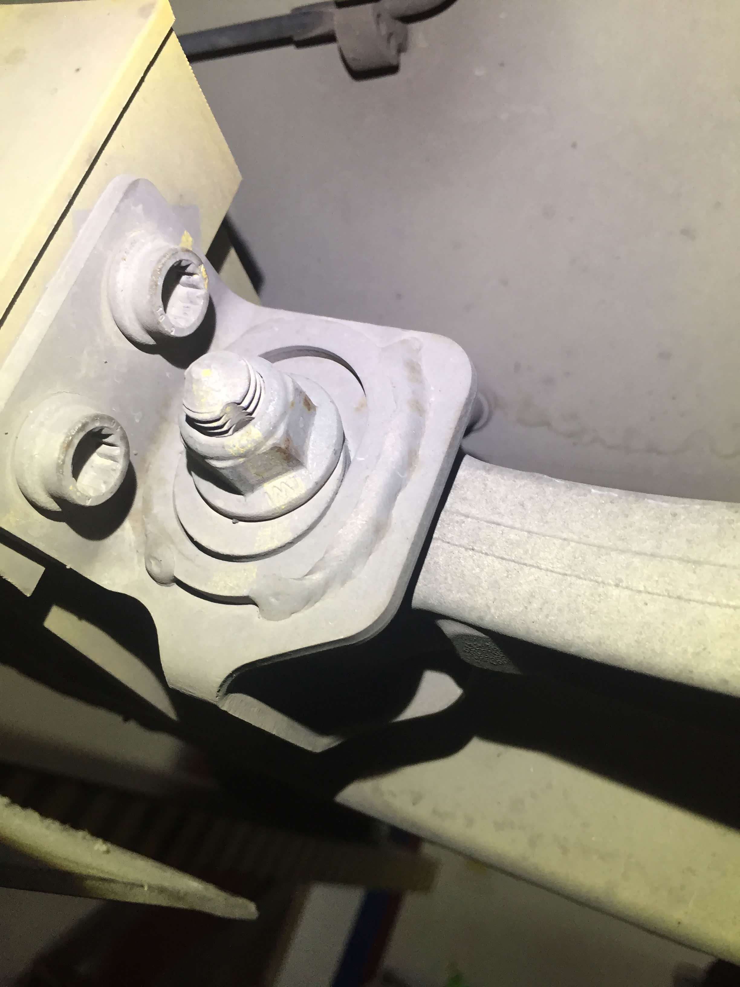 检查发现右前悬挂架件螺栓有拆装维修迹象,而且又重新做了标记,底盘螺栓很多都会附着灰尘不细心点的话很难发现拆装维修迹象,悬挂架潮湿那不是油渍是我们喷涂清洗液洗下螺栓有便于我们检查;蓝色标记的那个是羊角生产日期与车辆出厂日期对不上,我们判断这个部件进行过更换。