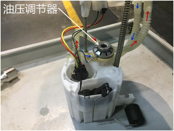 在汽油泵上一共有两条管路,其中红色的是出油管蓝色的是回油管。在回油管上有一个油压调节器对燃油进行调节压力,这个油压调节器是固定压力的,只有当燃油压力超过油压调节器的规定值才会将经过油压调节器流回到油箱。油压对于发动机来说起到直接的控制作用,如果油压压力过低会导致发动机的喷油脉宽变长,雾化效果也会不理想造成缺缸失火。如果燃油压力过高,会导致油泵一直出于高负荷的工作状态。用不了多久这个油泵就会烧掉了,这台1系的油泵就是这么挂掉的,因为油压调节器已经发生了卡滞,我用手都没按动。