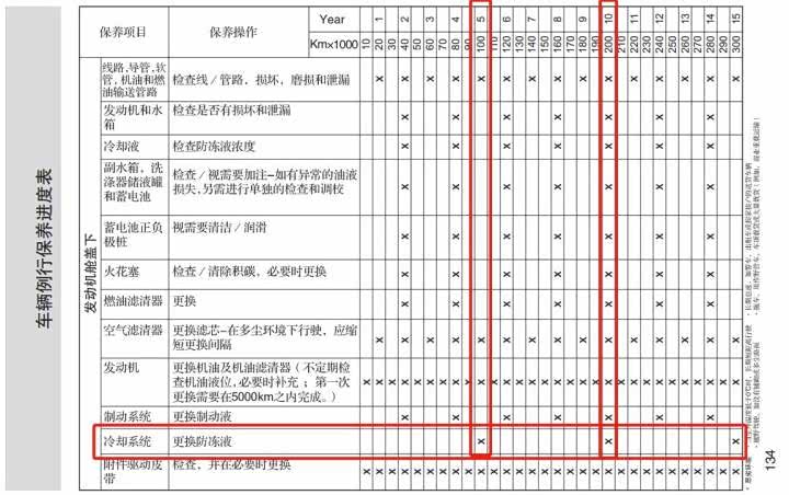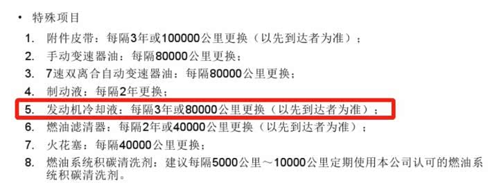 大众迈腾的说明书,只要求定期检查,压根不谈什么时候更换,原厂的G12冷却液的代工商巴斯夫给的建议是20万公里/10年首次更换,之后每10万公里/5年更换。