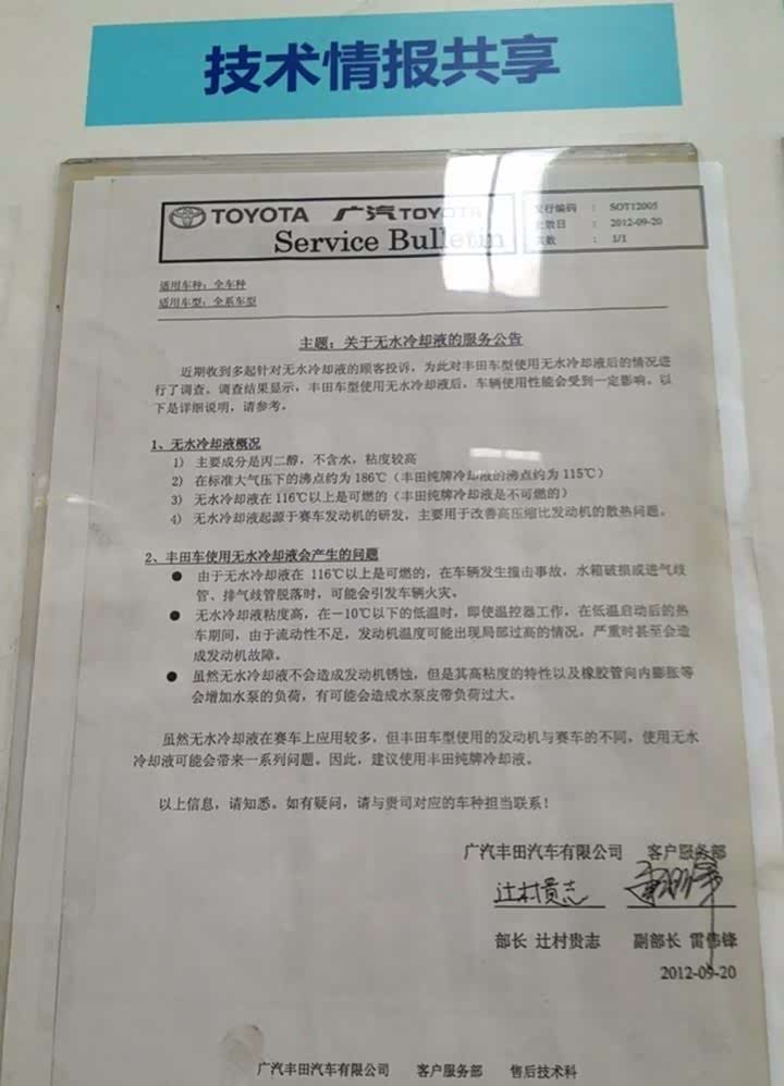 对了,丰田官方都出了通告告诉大家由于易燃、过热、加大负荷等原因告诫大家别换无水冷却液,但还是禁不住下面4S店对金钱的渴望啊。