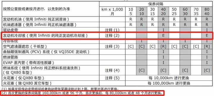 英菲尼迪96个月(8年)160000公里首次更换,之后每80000公里,48个月更换。