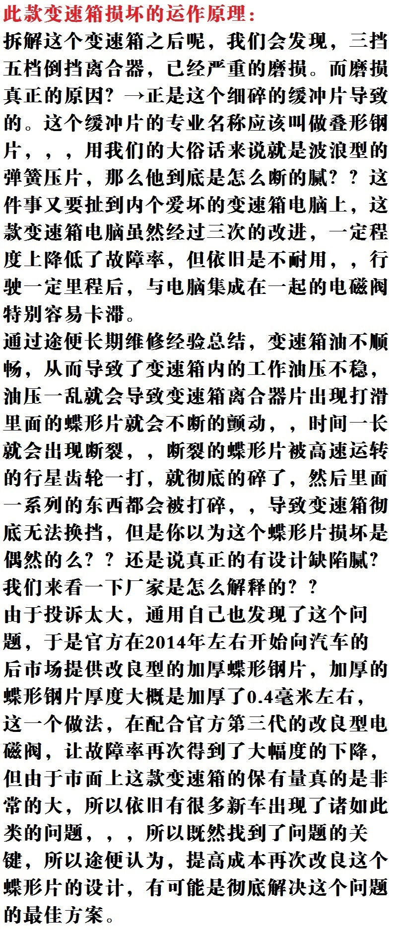 别克君威变速箱故障, 别克君威(参数|询价)这款车6万公里以后,变速箱里面里面有个零件叫缓冲片,换种说法叫波浪片由于设计缺陷容易蹦掉,这个零件嘣掉会引起变速箱功能唐欢,彻底不走车,加速无力的症状。这个豫章的原因是缓冲片的残渣会在变速箱里机器里磨成铁屑,大铁屑会磨损摩擦片(严重磨损会烧坏)及离合器鼓,磨损变速箱壳体和活塞。壳体磨损比较麻烦,严重造成变速箱功能瘫痪,不走车。另外别克金威这款车顿挫,冲击,异响,抖动,都是有变数箱电脑的原因。至于跑起来空油门,换挡迟缓,入党延时,灵车不走,打滑向香港都是由于变速箱油温过高或过低,时间久了摩擦片就坏了。无法行使