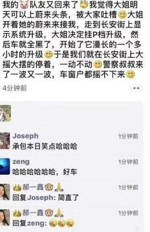 “蔚来”,“升级”,“长安街”,“停车一个多小时”,“车窗户都摇不下来”,这一连串关键词让很多网友炸了锅,纷纷表示这真是本日最佳的笑点。