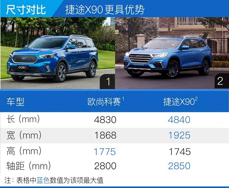 欧尚COS1°科赛(下文简称欧尚科赛)官方指导价为9.39万-14.58万元,捷途X90官方指导价为7.99万-14.19万元。此次我们选出两款的顶配车型来进行对比,分别是2018款科赛1.5T自动 智和2019款捷途X90 1.6TDCT尊贵型7座。