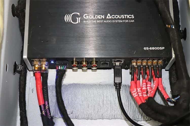 黄金声学GS-680 DSP安装特写,功放的一根根接线整整齐齐的,专业技术的体现~
