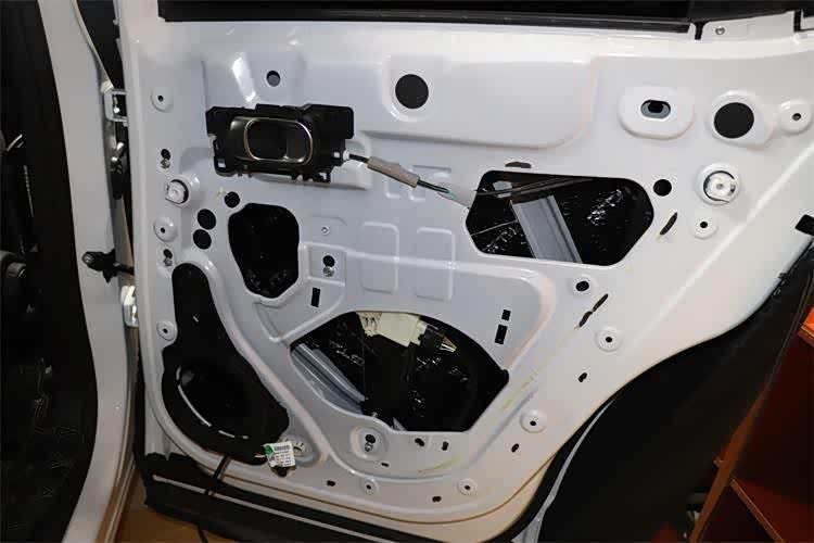 进行汽车音响改装之前,先要对四个车门进行隔音处理,门板的隔音既能够减少往车厢里传递的噪音,同时可以给汽车音响提供一个安静发挥的环境。因前后声场的中低音喇叭都要原位安装在车门原装喇叭安装位置上,所以四门隔音显得尤为重要。台州慧声改装技师使用了GT隔音材料对车门做了内外双层隔音。