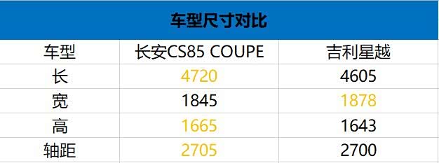 从动力性能来说,理论上星越要更胜一筹。不过,在笔者看来两者应该是平分秋色。因为在尺寸方面,长宽高4720*1845*1665mm,轴距2705mm的CS85 要比星越大出不少,其自重也更高,由此影响了其加速性能。不过,就空间而言,CS85就要完胜星越,在保证轿跑SUV运动性能下,也带来更高的家庭实用性。