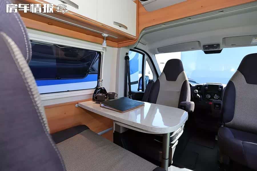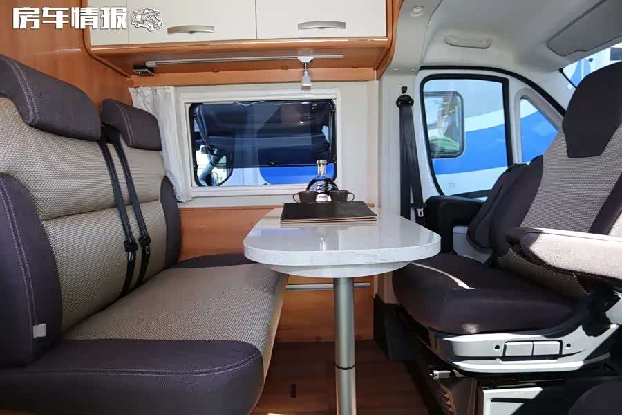 会客区配有一组采用居家风格面料的双人座椅和一张可拓展台面的餐桌,驾驶室座椅旋转过来正好形成一个四人对坐的格局,沙发的侧上方还配有一组储物柜,可以放置一些小件物品。