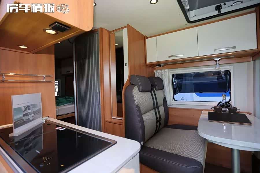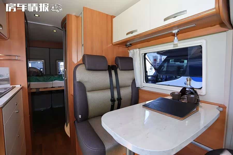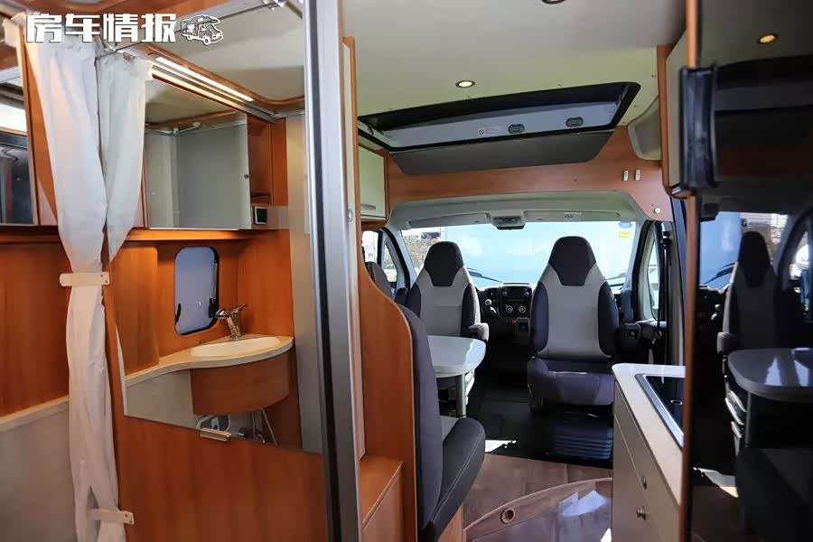 进入车厢内部,起居室采用开放式设计,对于一款B型房车来说,整体空间还算宽敞,常见功能区域均有配备,简约大气。