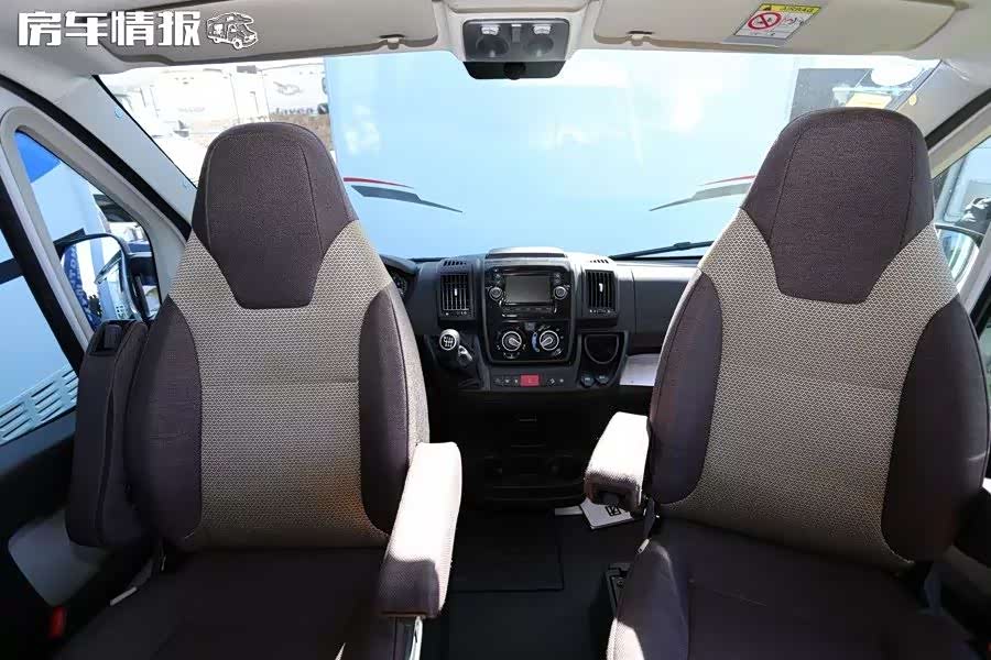 进入驾驶室,正副驾驶均带有安全气囊,中控台上方还配有手机平板电脑支架,正副驾驶座椅均可向后旋转;动力方面,搭载2.3L柴油发动机,匹配6速手动变速箱,油箱容积100L,满足国五排放标准。
