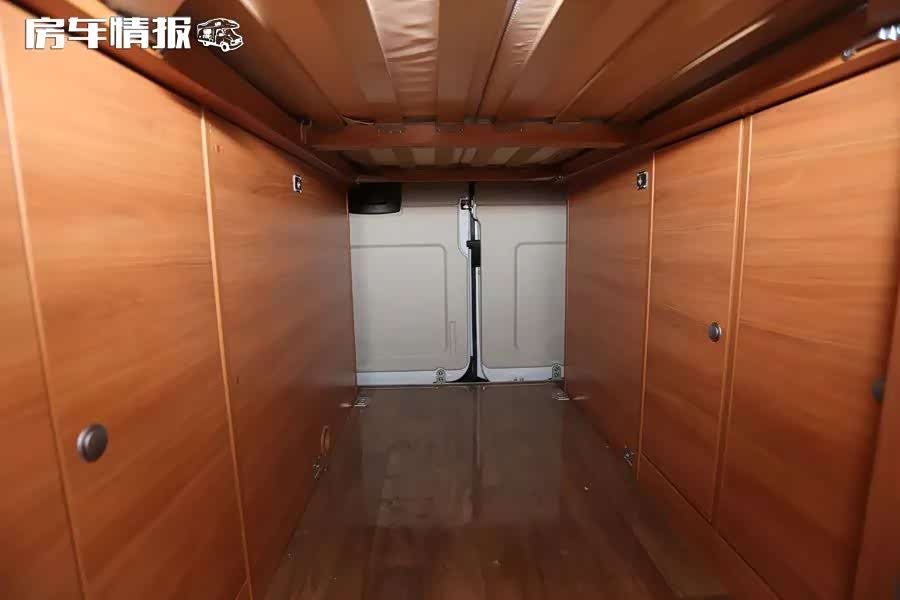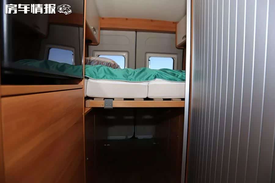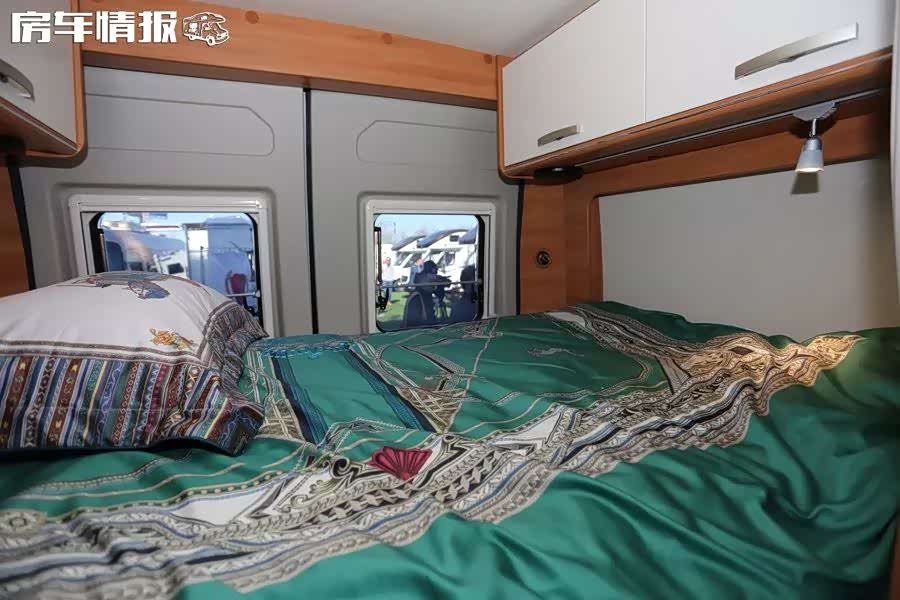 最尾部是一张横置的双人床铺(配有布艺窗帘和乳胶床垫),床铺的尺寸为1750*1350mm,满足两个成年人的整车休息使用,床铺上方配有阅读灯和储物柜,可以放置一些衣物,床铺下方是一个空间超大的贯通式储物空间,可以在此放置大件的行李物品。