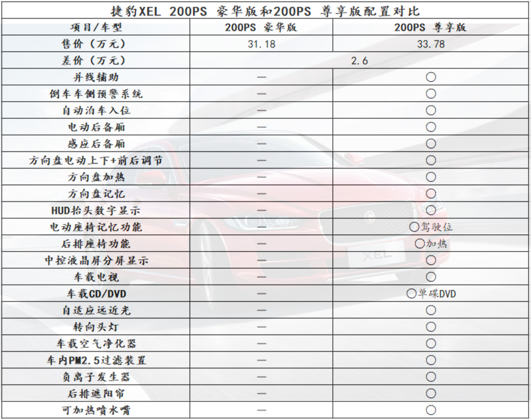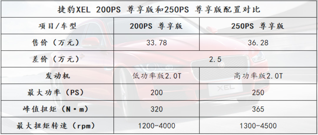 单单从车型命名你应该也能预想到,200PS尊享版和250PS 尊享版两款车的基础配置是完全一致的,两款车仅仅只是在动力总成方面有差异,200PS 尊享版搭载的是最大功率为200马力,峰值扭矩为320牛·米的低功率版本2.T发动机。而250PS 尊享版搭载的是最大功率为250马力,峰值扭矩为365牛·米的高功率版本2.0T发动机。如果捷豹XEL是你的心中所向,而你又是一个激烈驾驶爱好者,多花2.5万元也未尝不可。但如果你只是想满足日常驾驶需求,这2.5万元可以考虑省下来。