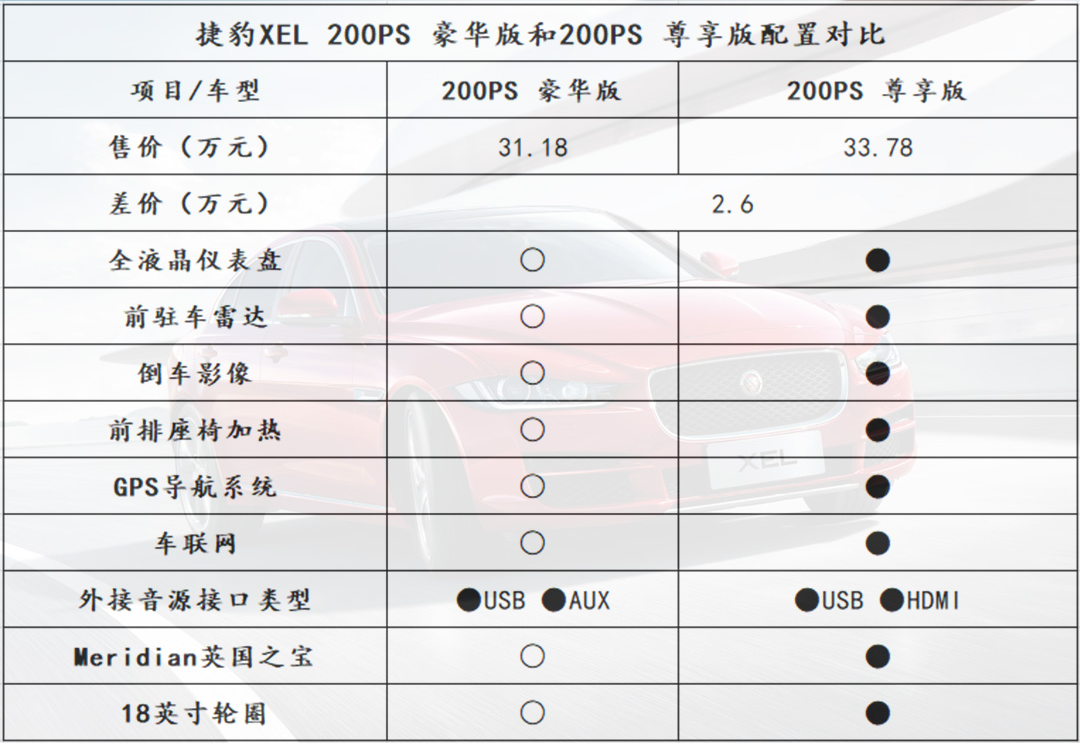 单单从差价幅度来看,尊享版(200PS)/豪华版间的差价比豪华版/精英版间的差价还要小——“仅”贵了2.6万元,但它增加的配置都是看得见摸得着的,例如:能让捷豹XEL看上去更符合其中型车定位的18英寸轮圈、能带来更好视觉体验的全液晶仪表盘、能带来更好听觉体验的Meridian英国之宝音响以及能带来更好乘坐舒适性的前排座椅加热等等,花2.6万元能增加如此丰富实用的配置,总的来说是非常值得的。