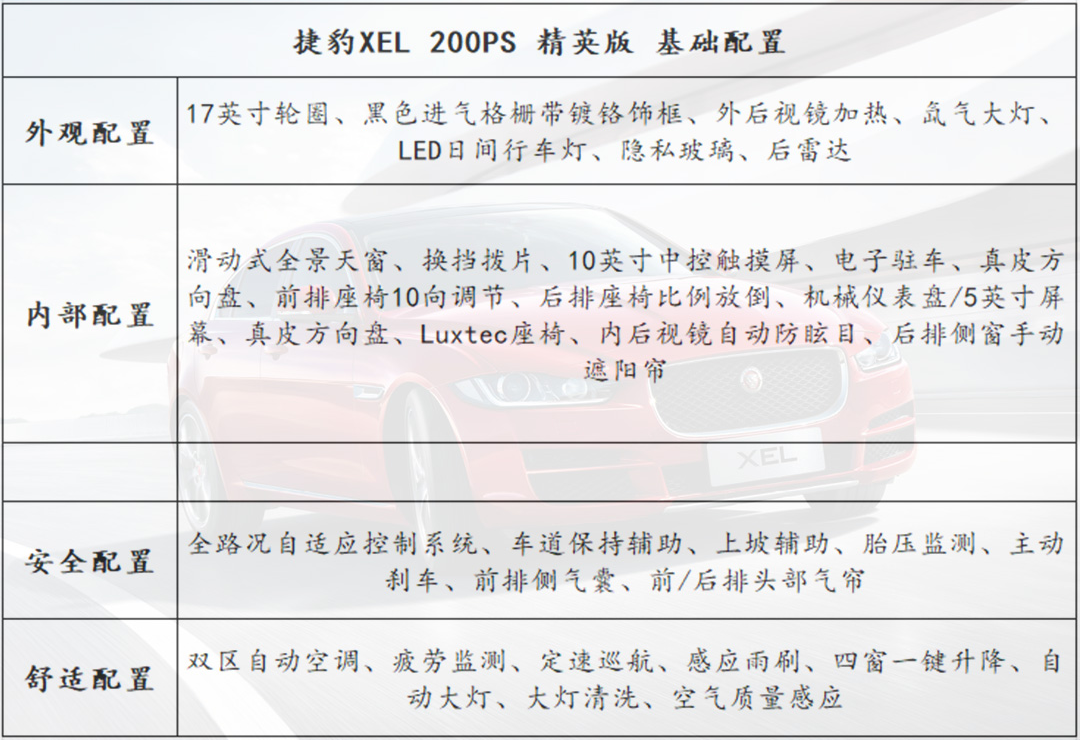 和很多车型不同的是,它们的入门版车型往往只是为了拉低车型起售价而存在的,对于消费者的选购意义并不大,但捷豹XEL是个另类,它的入门版车型——200PS 精英版反而是我最推荐的车型。国内消费者注重空间表现,而轴距加长之后,它的后排腿部空间、头部空间都得到了不错的改善。而包括外部配置、内部配置、安全配置以及舒适性配置,也足够丰富,再加上“仅”需28.18万元的售价,整体的性价比非常高了。