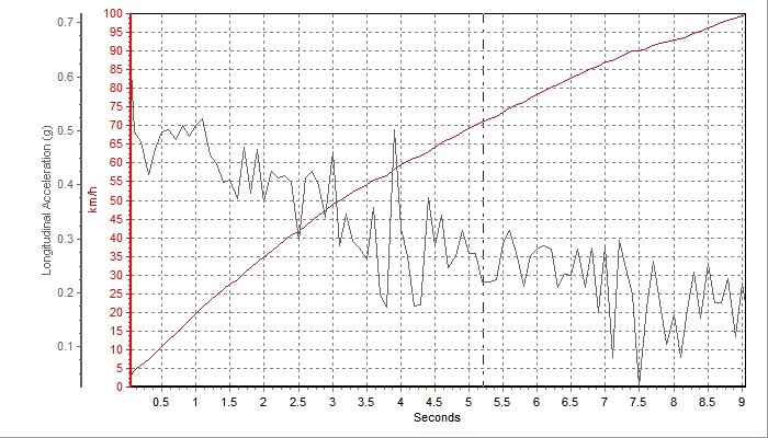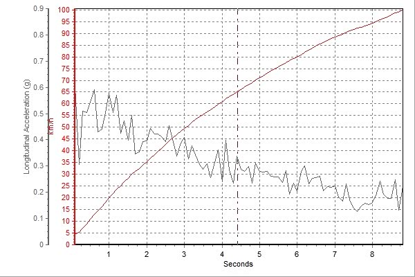 可看到起步初段的G值直接冲破0.5G(初段推背感的来源),随着变速箱一升二的过程中,推背感因为短暂的动力中断减弱。后段加速过程换挡节奏衔接紧密,能让驾驶员感到不错的节奏感。最终我们做出的百公里最佳加速成绩为9.12秒,这个成绩甚至比之前的1.5T+7DCT(国五)的加速时间还慢(8.9秒)。