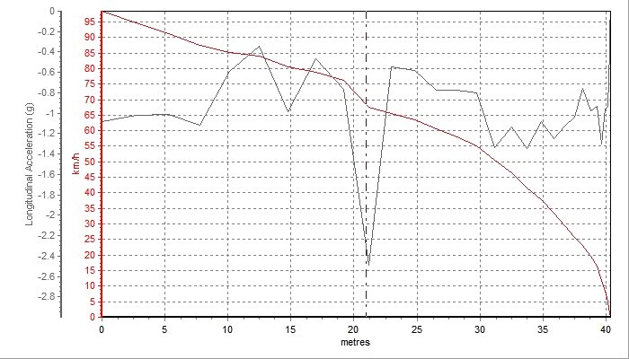 按照常理来说,马牌ContiSportContact5 CSC5作为一款主打性能的轮胎,放在02这样尺寸的车型上,轻松刹进个35米内是不成问题的。不过在多次测试下来,成绩虽然都相对稳定,但最佳的成绩仅为41.5米,对于一台小尺寸的车来说,算不上优异。