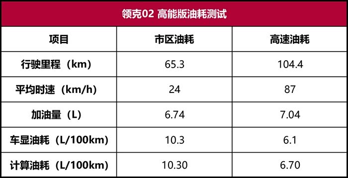最终的市区油耗,我们做出领克02高能版的市区油耗成绩为(平均时速24km/h;实算10.3L/100km),比起1.5T(平均时速23.4km/h;实算12.49L/100km)更优秀。