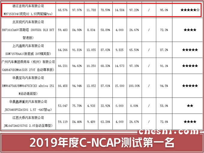 2019年4月16日,中国汽车技术研究中心有限公司在上海车展期间发布了2019年度C-NCAP第一批7款车型的评价结果。其中吉利高端品牌领克旗下的02以95.0%的最高综合得分率获得最高五星+评级,超越了同批测试车型——宝马X3(五星评级),成为现行中国汽车安全碰撞标准体系2018版规则实施以来唯一获得五星+成绩的车型。
