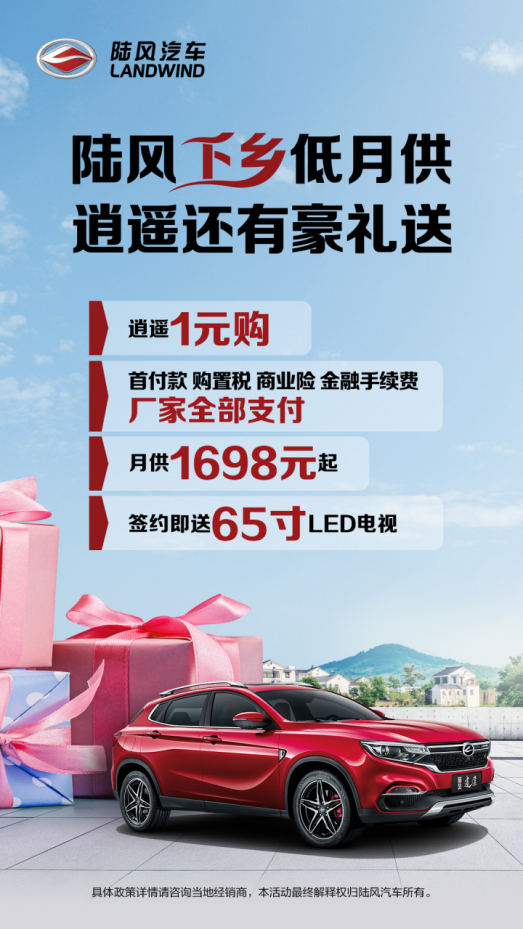 在活动期间,陆风逍遥还参与“一元购”活动,即符合条件的车主只需要付1元就能把新车开回家,最低月供1698元起,而首付款、购置税、商业险等费用则一概由厂商来支付。陆风汽车还提供多种还贷期限可供选择,多角度照顾不同需求的车主。同时,先到先得,前100名签约的车主还有65寸的LED品牌电视机相送!