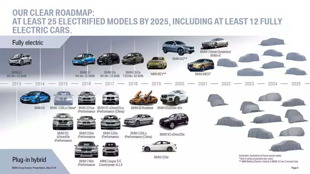 从宝马品牌在6年内规划25款新车这个动作来看,足以证明宝马对于新能源市场的重视,其中纯电车就多达12款。而宝马品牌首款纯电动车宝马iX3计划于2020年在华晨宝马工厂生产,并出口到美国以及欧洲地区。目前,2019年5月份已接近尾声,即将迎来的是全新MINI纯电动车和宝马330e插电混动车,至于新车会有怎样的表现,我们拭目以待吧!