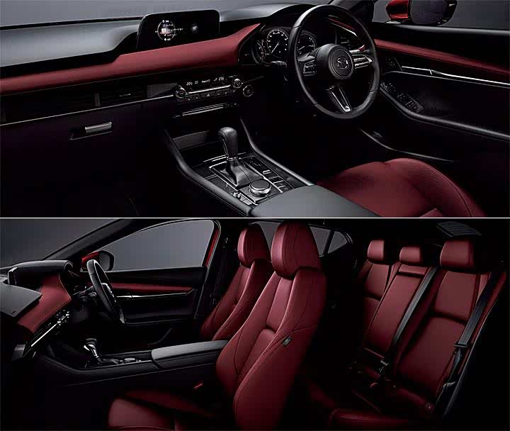 内饰配备部份,日规 Mazda3 全车系也将标配具有 New Mazda Connec 界面的 8.8 吋 TFT 中控悬浮式荧幕,并具有 Apple CarPlay 与 Android Auto 连接机能,但相较前一代取消中控荧幕触控功能,仅能使用 MZD Connect 旋钮操作。音响全车系则标配 8 支喇叭,至于拥有 12 支喇叭配置的 BOSE 音响系统则会列为选配。红黑配色的 Burgundy Red 内饰,则仅供 5 门 Burgundy Selection 车型搭载。