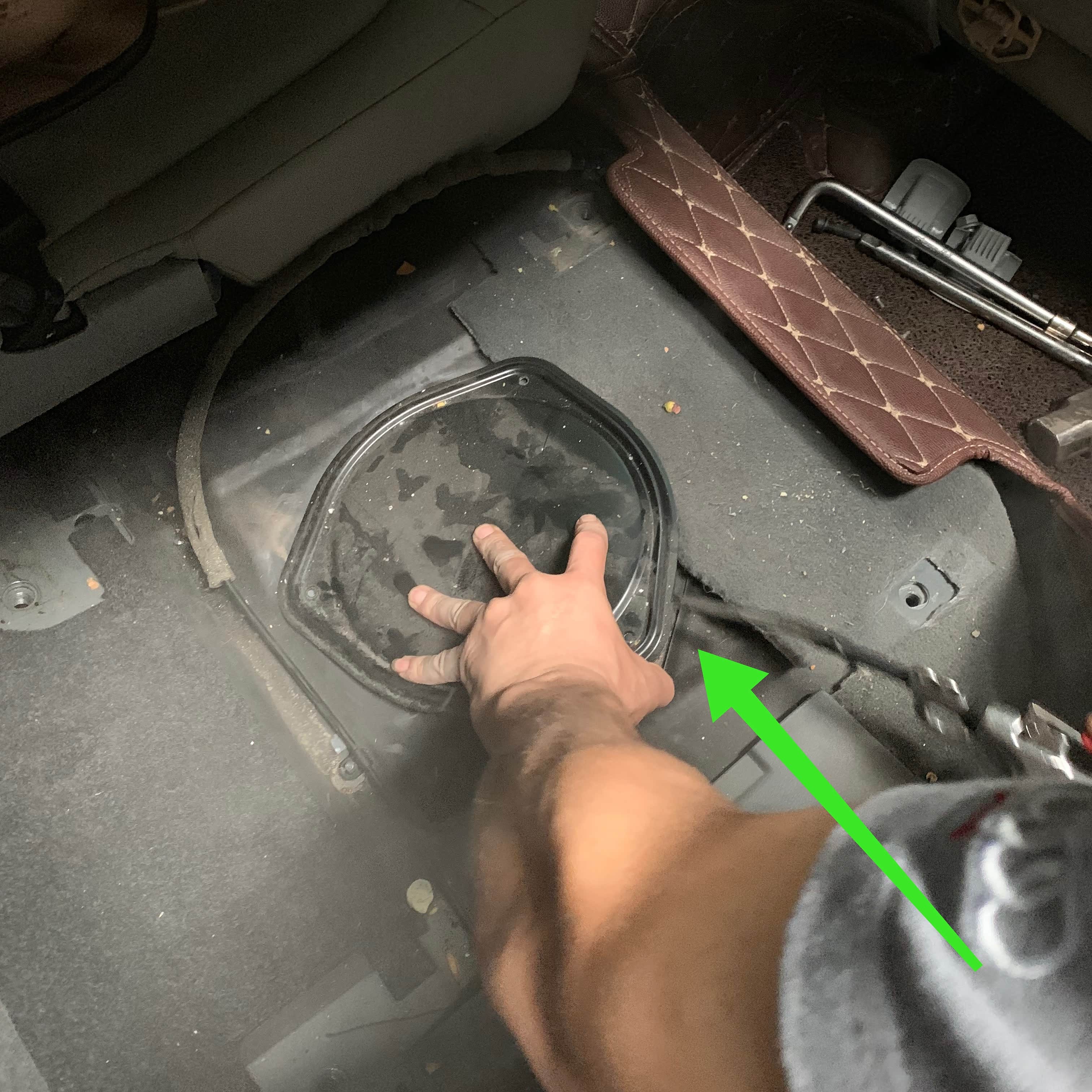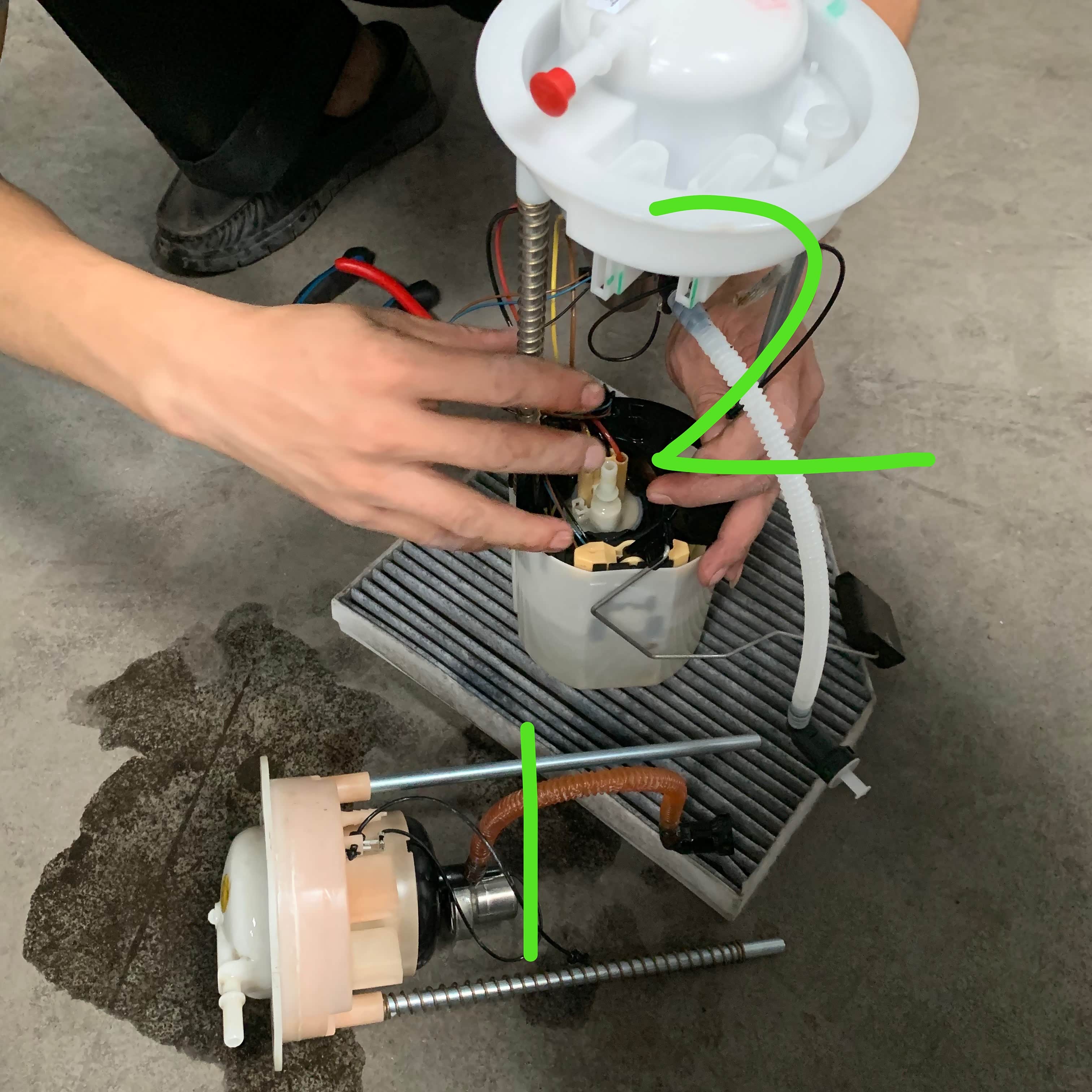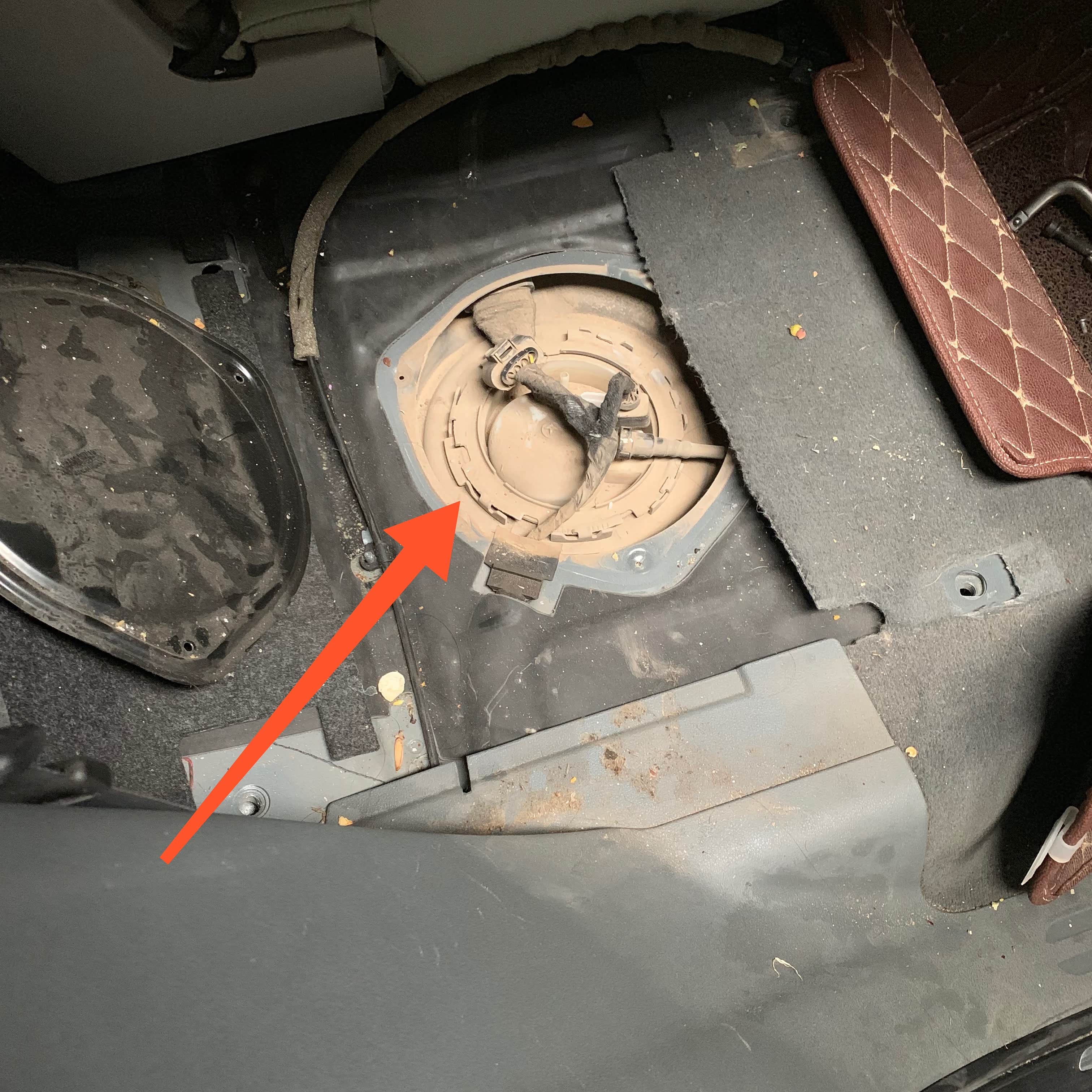 它的滤芯在副驾驶后座的下部设计,需要先把右后侧的座椅拆下,然后拆下座椅下面的铁板。这之后,我们就可以看到油箱上面的油管和油泵插头,也就是下图箭头所示的情况。