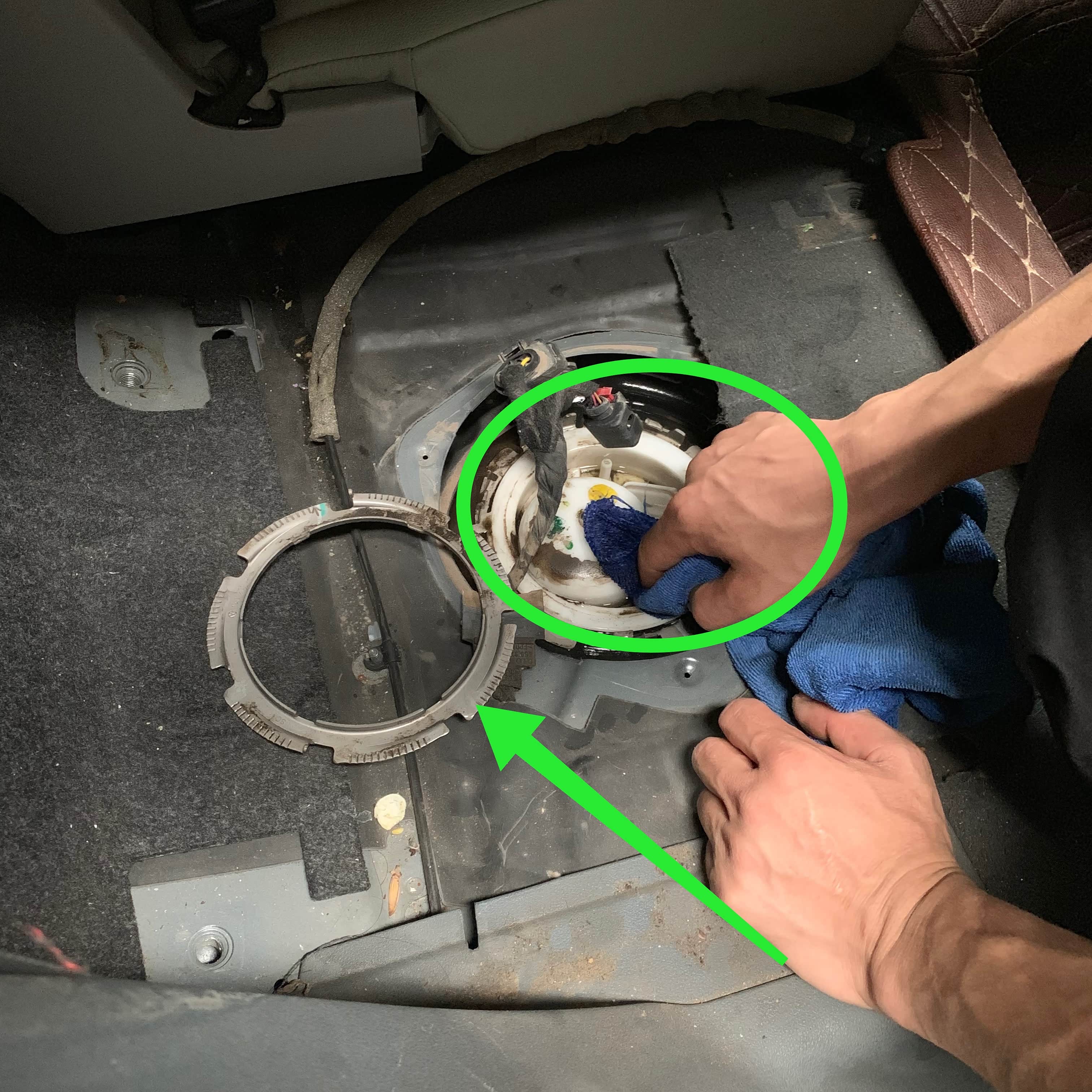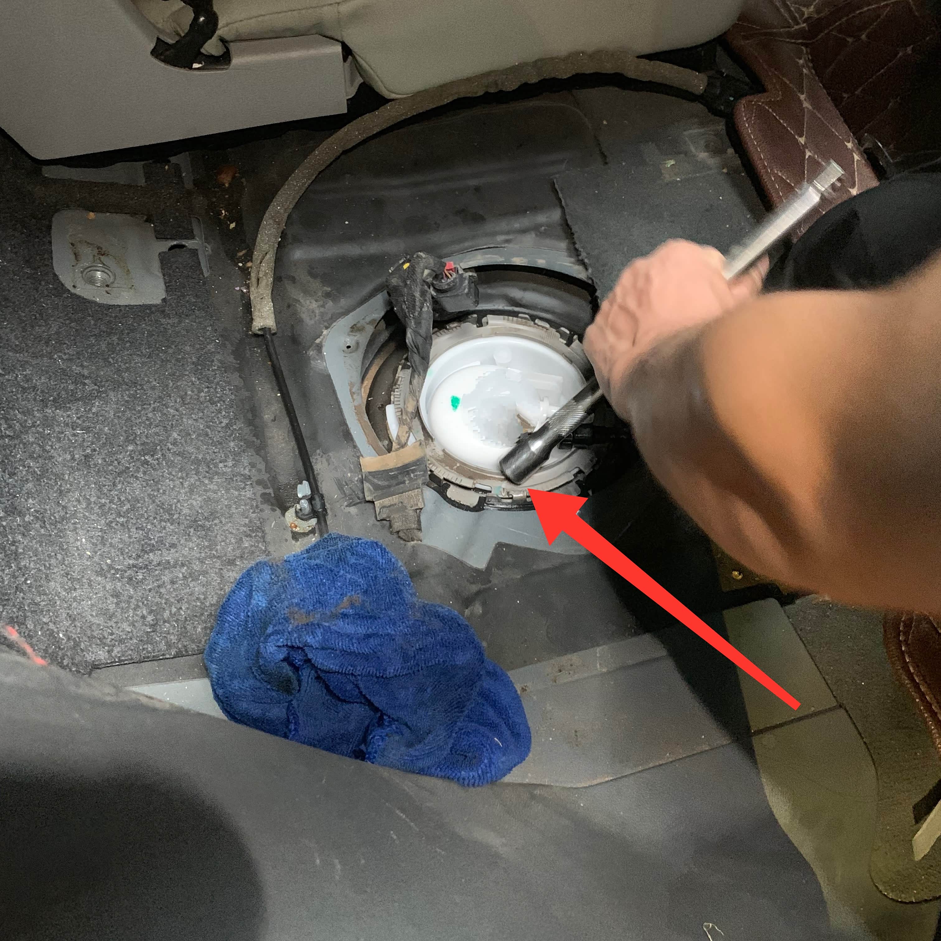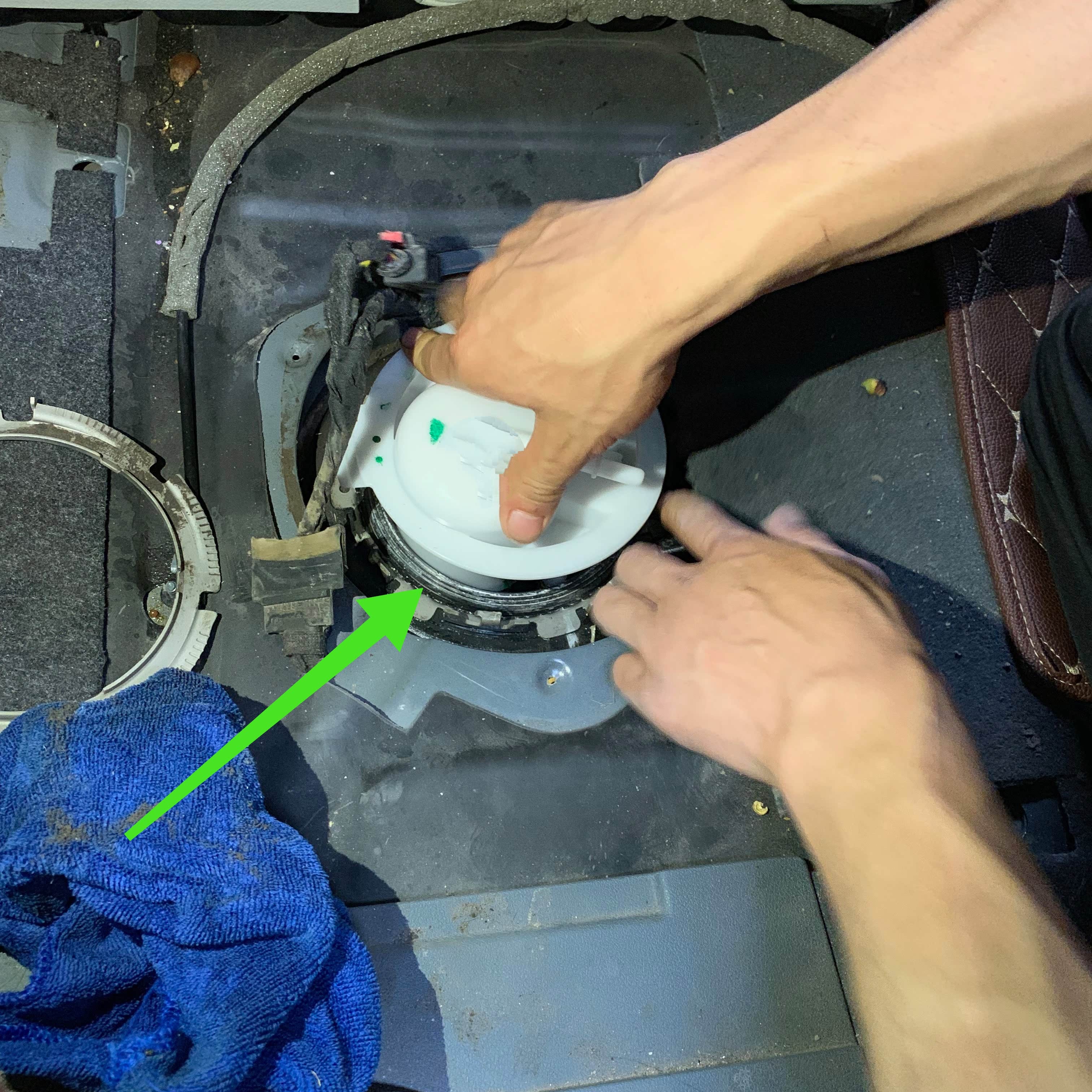 下图所示,师傅正在安装油泵总成。在这里,最需要注意的是箭头所示的橡胶密封垫,不能让它出现扭曲等问题,若是密封出现问题,汽油有可能会通过这个位置渗出,很危险。