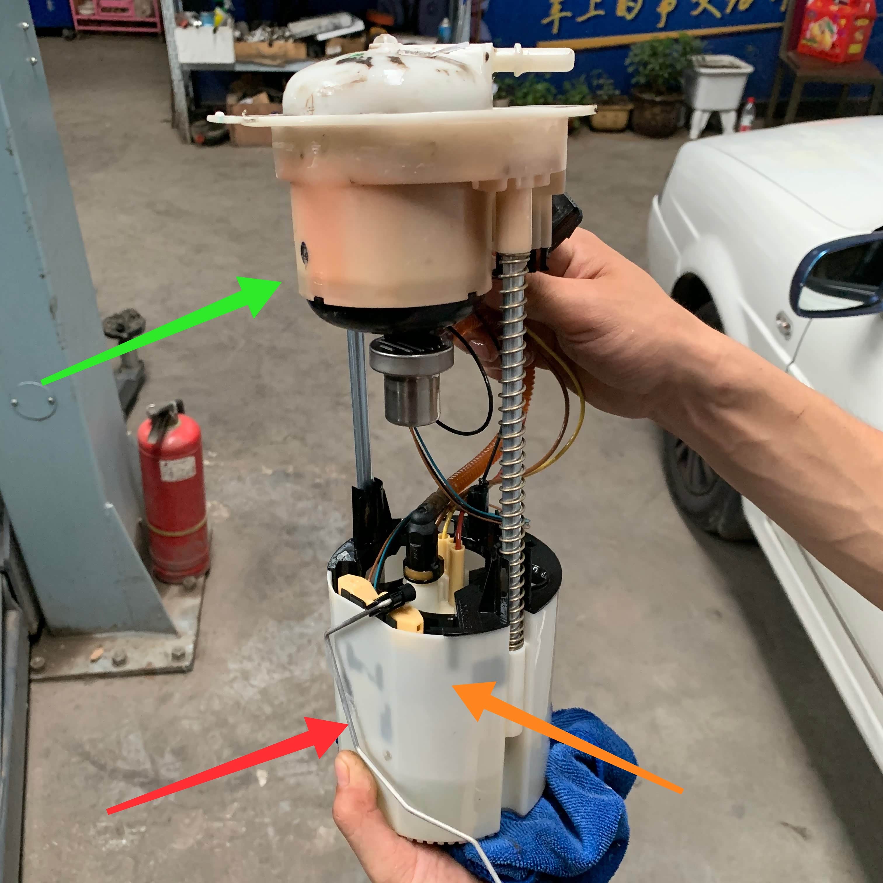 下图所示,这就是拆下的油泵总成,主要由上部的滤芯和下部的油泵、油浮子组成,而我们需要更换的只是绿色箭头所示的滤芯,油泵以及油浮子不用换。车主也正是看到这样的滤芯才有些困惑,滤芯和油泵在一起设计。