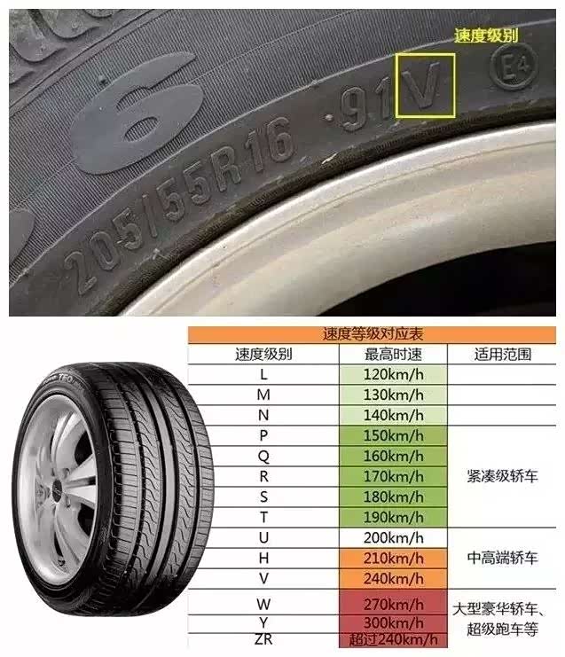 再来说说轮胎的速度等级。轮胎的速度等级是指轮胎允许行驶的最高速度,一般用大写的英文字母表示,标注在轮胎的侧面上。不同的字母表示不同的速度等级,比如“L”表示最高允许车速为120公里/小时,“T”表示最高允许车速为190公里/小时,“V”表示最高允许车速为240公里/小时,等等。一般越高级的车,使用的轮胎速度等级越高。但是轮胎的速度等级也会随着轮胎的老化、轮胎弹性的下降而逐年降低,轮胎的压力也会影响速度等级,压力越低速度等级也随之降低。
