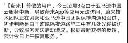 6月2日凌晨3点,由于亚马逊中国云服务中断,导致蔚来App等应用无法访问,蔚来技术团队紧密和亚马逊中国团队沟通、跟进,初步判断,由于1日晚隔夜道路施工中有几处光缆被切断,导致服务无法启动造成。