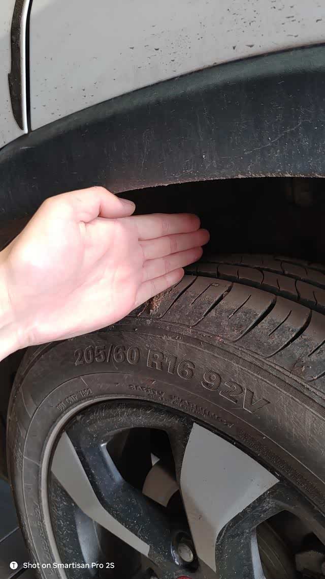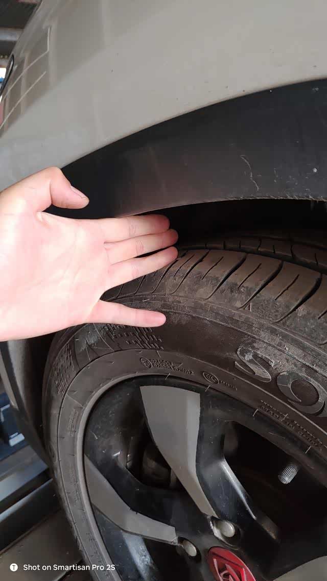 后轮留有4指的空隙,不过据这位车主说,后轮在满载的时候不会碰到轮眉,嗯!不过在过减震带的时候会不会碰到就说不清楚了!