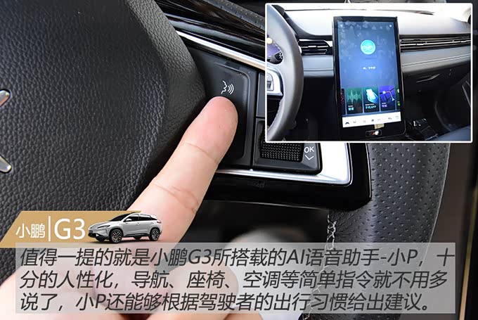 在小鹏G3的众多智能科技配置当中,我认为最有意思的就是G3的AI语音助手功能,它特别的智能化,开关窗户什么的根本不在话下,你可以直接和它聊天,想听的歌,想去的目的地,空调太冷或者太热就直接告诉小P就好,它会直接明了的读懂你的意思。另外智能地图功能特别好用,想去哪里,直接告诉小P,它在几秒钟之内就能智能地规划好几条不同路线,诸如最近的路线,不收费的路线,不拥堵的路线等等,还能第一时间告知你终点附近的停车场,不会让你发生没有地方停车的尴尬和违章停车产生的罚款。