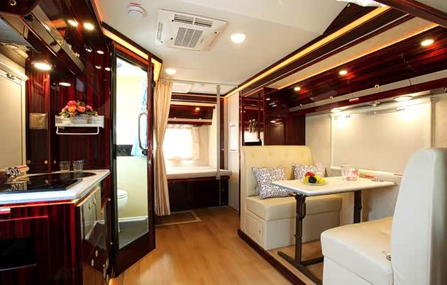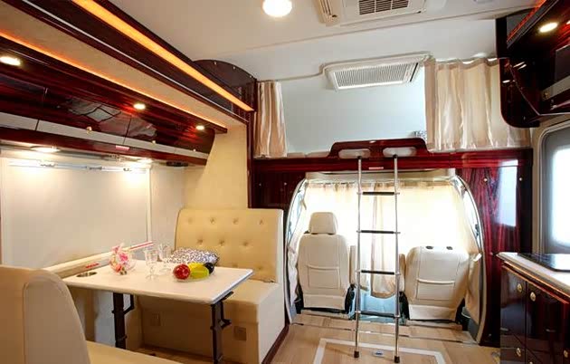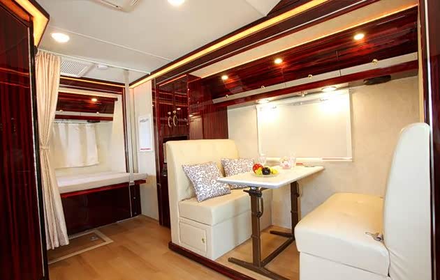 进口UF面料豪华双人沙发和灯式水杯槽的餐桌,让印象中艰苦的户外露营生活也会有在家时的奢华。该沙发还配有安全带,在车辆行驶过程让中安全得到保证。晚上休息的时候将餐桌降到最低就会和卡座沙发形成一张单人床。