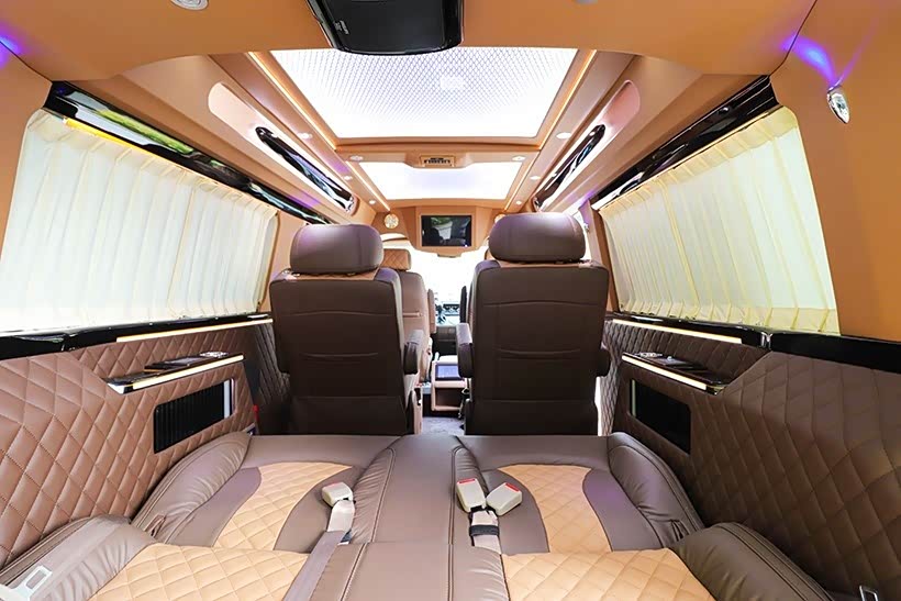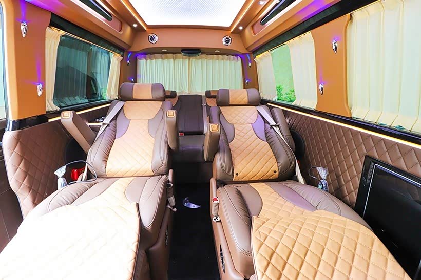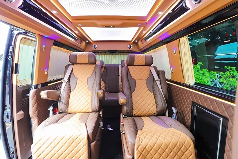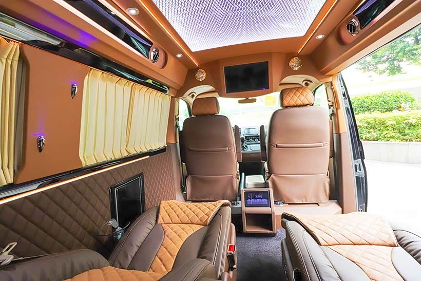 全车航空舱真皮按摩座椅,前后2+3分布,中间过道宽敞方便乘客出入车舱后部;