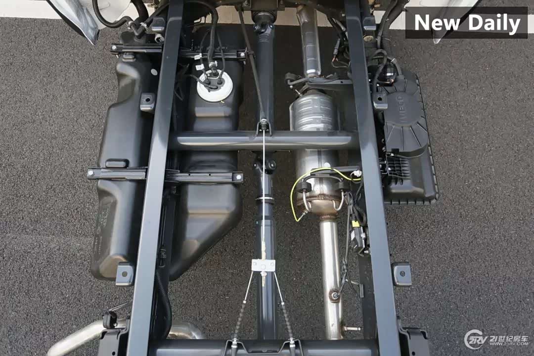 欧胜与New Daily均采用非承载式车身结构,下面咱们看向底盘部分,两车在底盘的布置上基本一致,值得一提的是New Daily车身采用了特种钢材。底盘左侧体积较大的黑色箱体为树脂材质油箱,底盘中间位置布置有传动轴,上方是Y字型手刹连接线,传动轴右侧为排气系统,不同的是New Daily多出了一套尾气后处理系统,针对废气中含量较高的氮氧化物(NOX)进行处理,因此在排气消音鼓右侧还布置有尿素罐。另外从上图可见New Daily排气系统上还连接有氨和二氧化碳的传感器,通过车架一侧的ECU装置调节排气温度使发动机尾气更加环保。