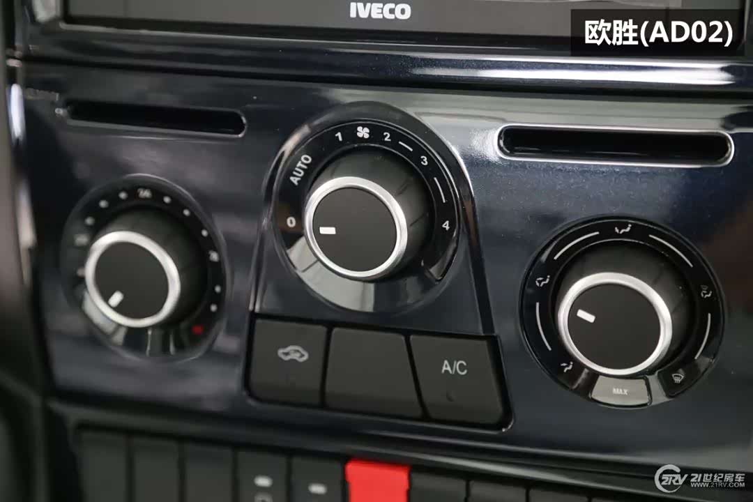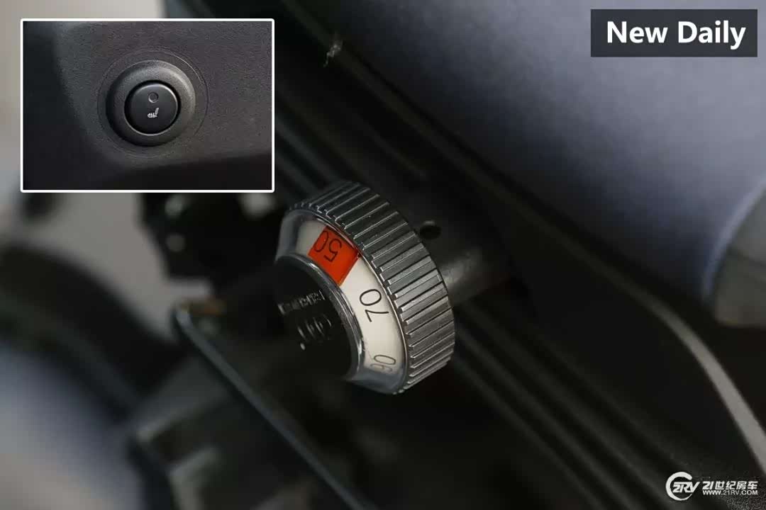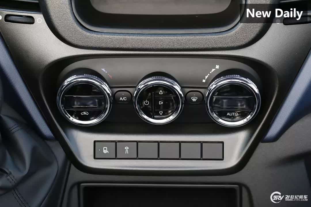 New Daily搭载了自动空调,旋钮还带有温度及风量显示屏,左边旋钮可调节温度。右边调节风量大小,AUTO键可让驾驶舱自动调节至预设好的温度。