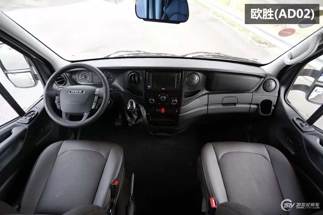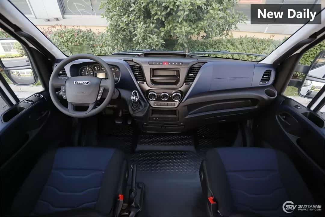 欧胜与New Daily在驾驶室上主要是配置的区别,相同的是两车均配备了多功能方向盘,但不得不说进口依维柯New Daily的驾驶室看起来更具质感,黑色与深蓝色的搭配低调内敛,飞翼式布局明显更有轿车化的设计语言。需要注意的是,由于欧胜驾驶室为封闭式结构,故无法拍摄驾驶室全景照片,上图中照片为基于欧胜打造的某品牌C型房车驾驶室实拍,区别在于房车厂家更换了皮革座椅并选配了中控屏。