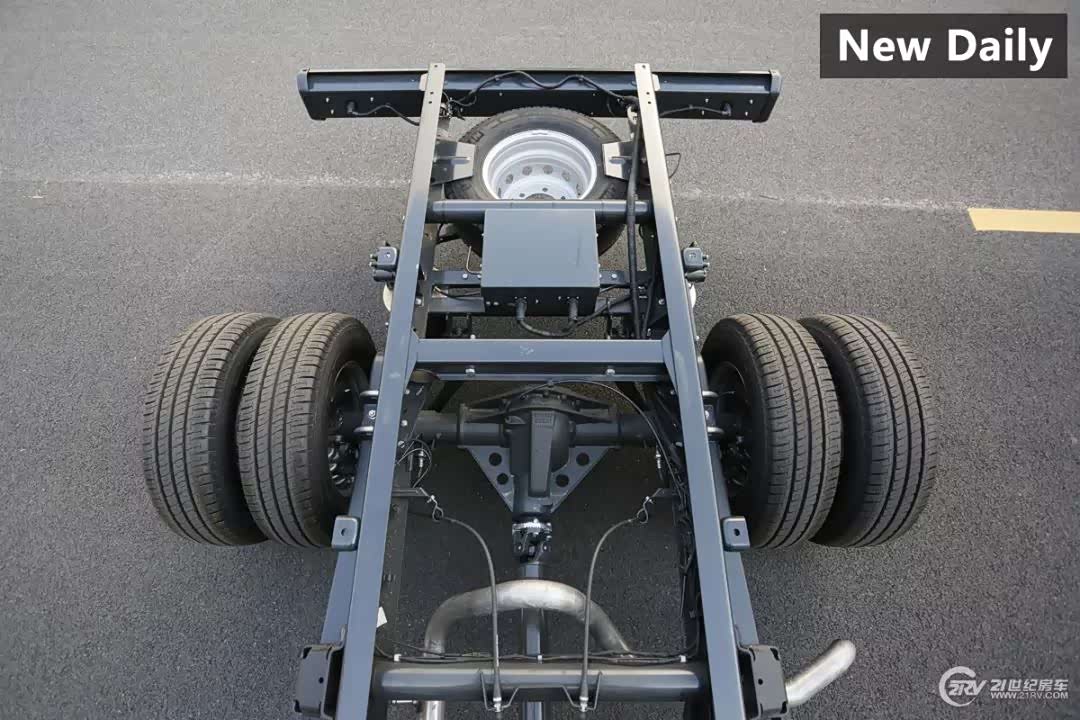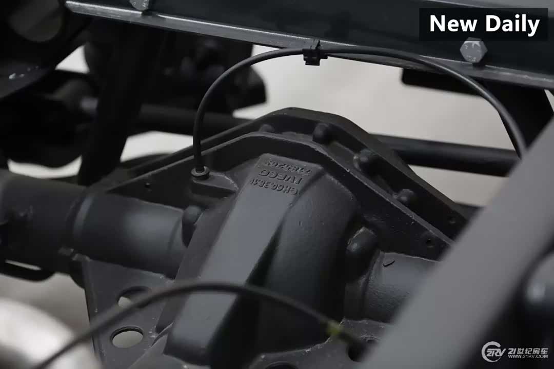 接下来看向底盘的后段,主要布置有后桥差速器、后悬架、空气悬架组件及底盘线束等。值得称赞的是,欧胜与New Daily均采用后桥双排轮设计,提升底盘的承载力及稳定性。