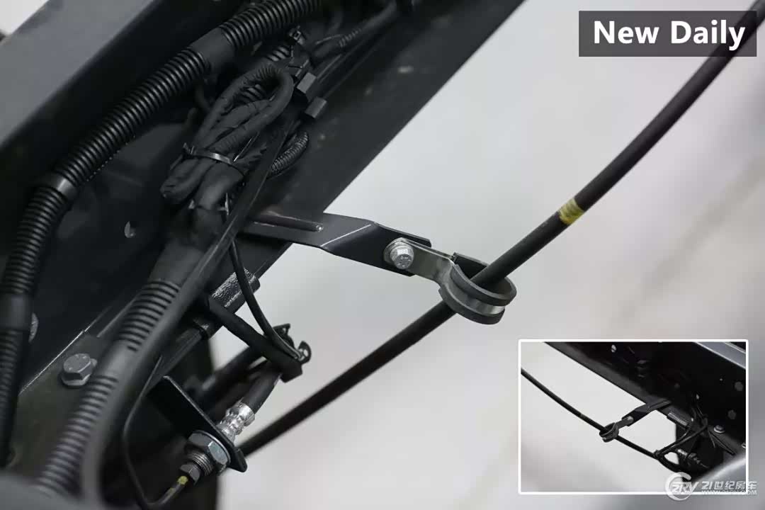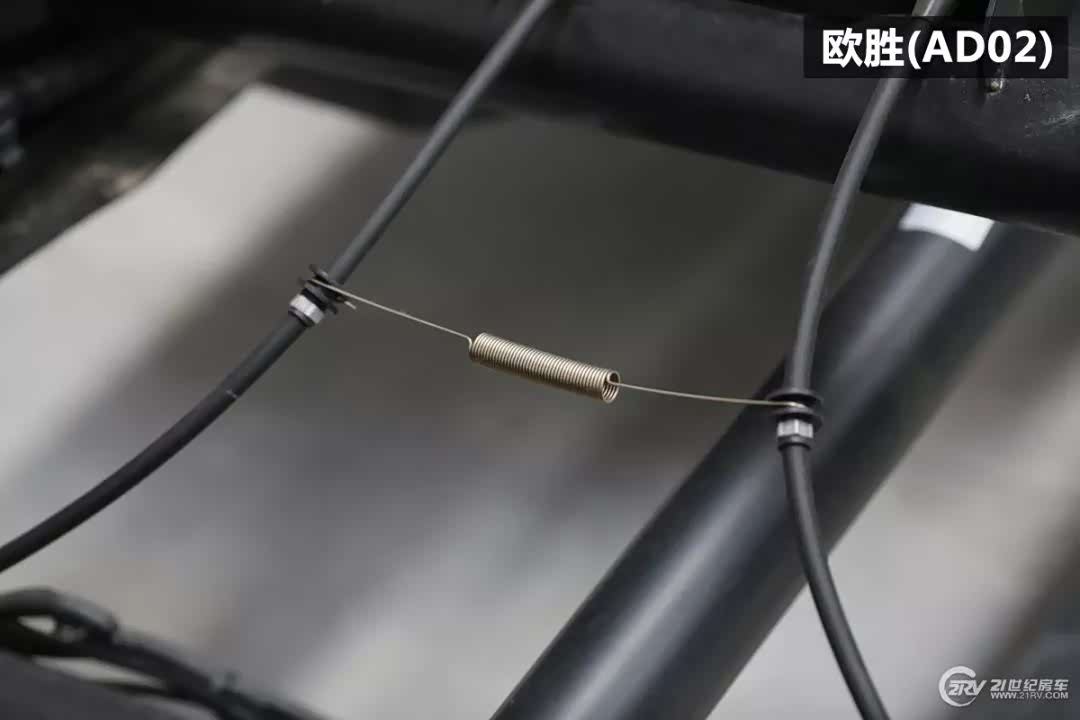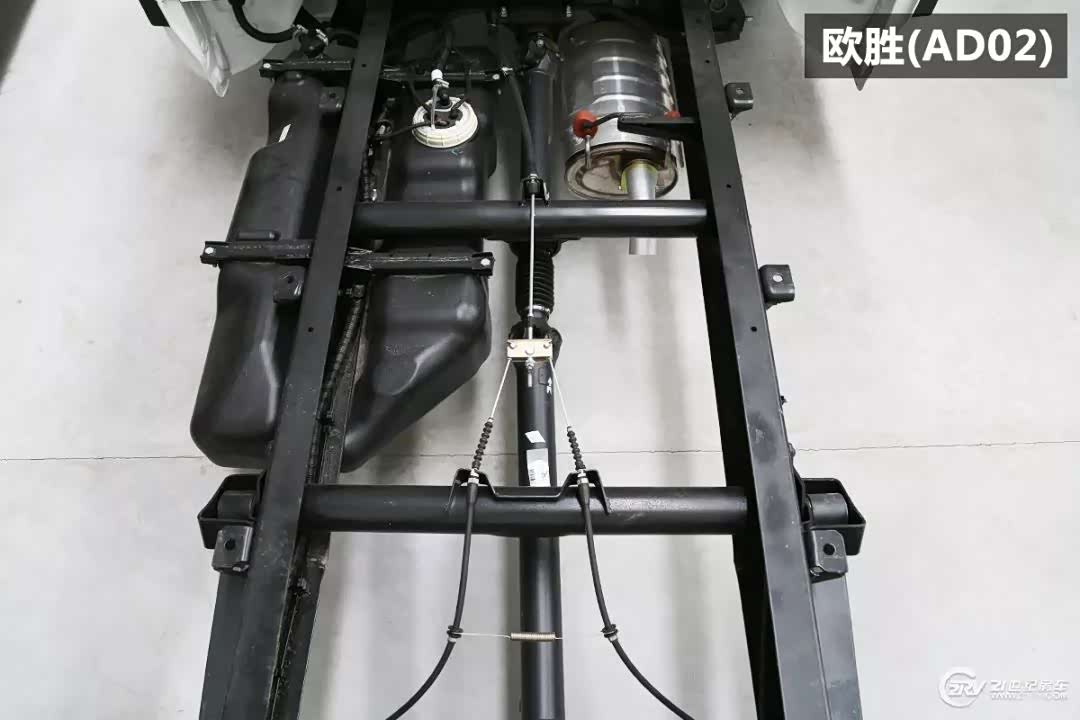 Y字型手刹连接线的末端分成两条分别与后轮两侧制动系统相连,欧胜与New Daily手刹连接线的固定方式不同,欧胜两条手刹线之间通过一根中间带有弹簧结构的金属件固定,而New Daily则在底盘两侧分别设有固定支架,相比之下更加稳定。