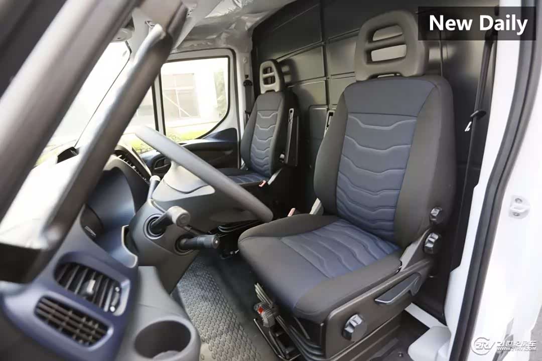 两车驾驶室座椅最大区别在于New Daily主副驾均搭载空气弹簧座椅,颠簸路段能够吸收路面震动,带来更舒适的乘坐感受;下方的旋钮能根据体重进行调节。另外New Daily驾驶室座椅均带有座椅加热功能,这在北方寒冷的冬季尤为实用。