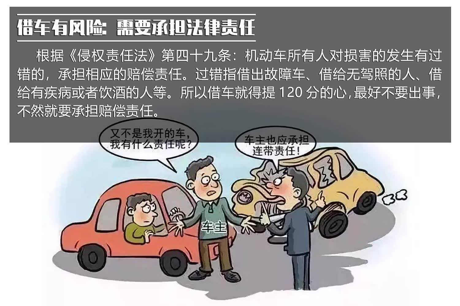 借车有风险 1 有可能要承担法律责任 《侵权责任法》第四十九条 赁、借用等情形机动车所有人与使用人不是同一人时,发生交通事故后属于机动车一方责任的,由保险公司在机动车强制责任保险责任限额范围内予以赔偿。不足部分,由机动车使用人承担赔偿责任;机动车所有人对损害的发生有过错的,承担相应的赔偿责任。” 什么叫有过错呢?比如借出故障车、借给无驾照的人、借给有疾病或者饮酒的人。所以借车就得提120分的心,最好不要出事。