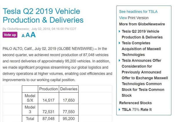 7月3日,特斯拉发布了2019年第二季度销量报告,据报告显示:特斯拉第二季度创下了生产和交付的新记录,三个月内共生产了87048辆电动汽车,并交付了95200辆。