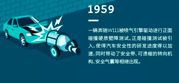 1959年,一辆奔驰W111被喷气引擎驱动进行正面碰撞硬壁测试。正是碰撞测试被引入,使得汽车安全性的研发速度得以加速,同时带动了安全带、可溃缩的转向机构、安全气囊等相继出现。