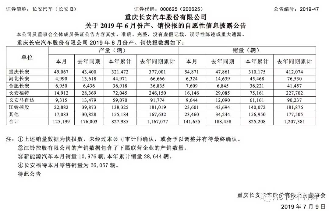 车家号·0浏览·2019-07-09 17:46 · 北京7月9日,长安汽车(证劵代码:000625)披露了6月份产、销公告。