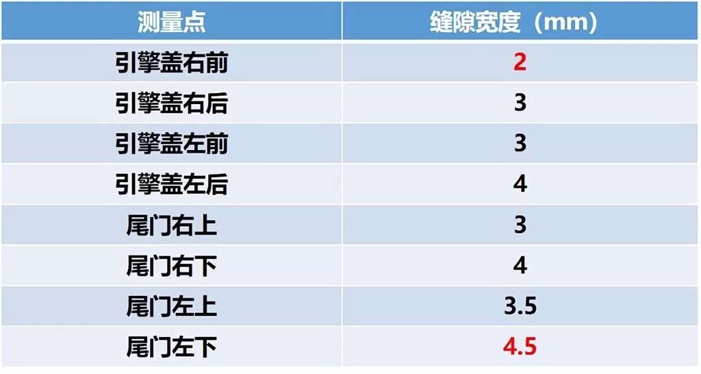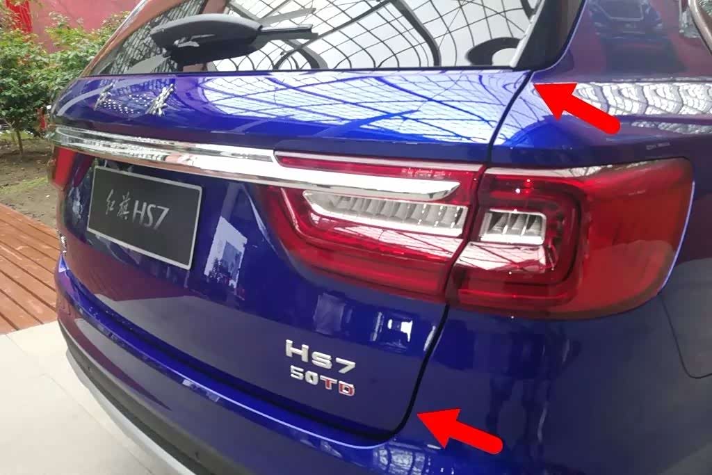 我们在HS7上选取的钣金缝隙测量点共有4对8组,分别是引擎盖靠近A柱下端左右缝隙、引擎盖前端靠近车灯的左右缝隙,尾厢门上端靠近后挡风玻璃左右缝隙,尾厢门下端靠近底部的左右缝隙。基本上可以这样说,这4组数据足以反映一款车的钣金拼装水准。