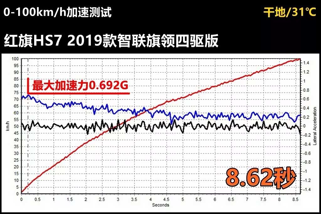 弹射起步瞬间,变速箱就输出最大加速力;8.62秒的0-100km/h加速最好成绩,则符合我们之前对这款车的预期——动力虽然和奥迪Q7差不多,但加速应该会比奥迪Q7慢,毕竟人家Q7可是铝合金车身。