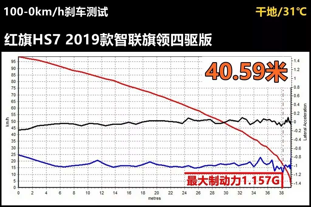 至于100-0km/h刹车测试,40.59米的最短刹车距离出现在第3次测试,5次测试平均成绩则达到了42.63米,5次连续刹车的热衰减率约为5%——这是一种不太理想的情况。从图中不难看出,HS7的最大制动力出现在刹车末端,或许原因就在于此。如此看来红旗的工程师还有得忙。