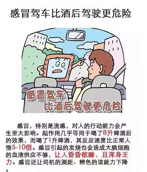 感冒:车祸的潜在隐患。感冒虽是小病,但驾车的司机对此却不能等闲视之。感冒时,伴有头痛、头晕、咳嗽、疲劳等症状,不仅影响司机的精神与体力,也会成为肇事的潜在隐患,有时只因一个喷嚏,一滴鼻涕,也会令司机措手不及而闯祸。