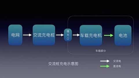 与快速充电原理相反,慢速充电是将国家电网中的交流电输入电动汽车的慢速充电接口,经过电动汽车内部的车载充电机,将交流电转换为直流电,再输入到动力电池,完成对动力电池的充电过程。