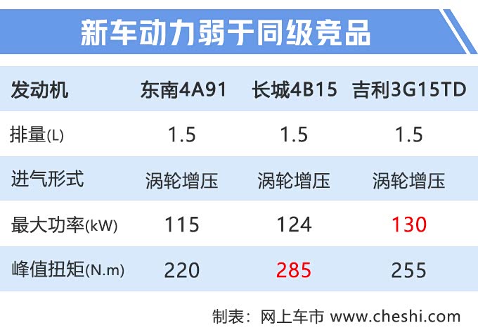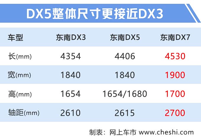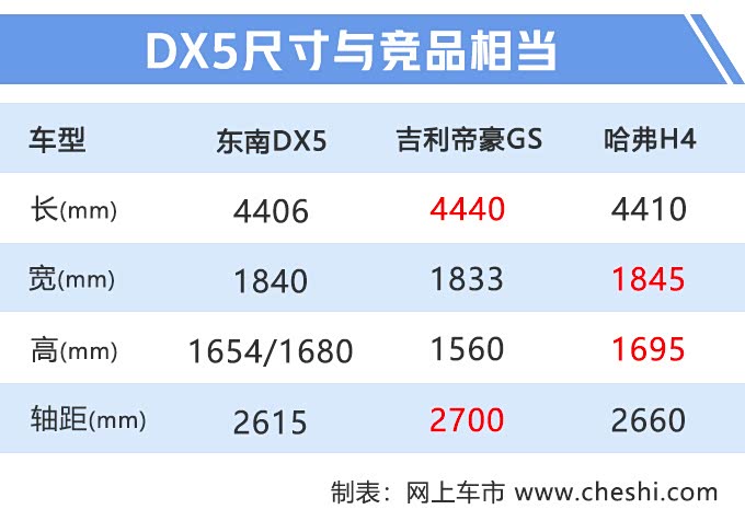 东南DX5整体尺寸与吉利帝豪GS、哈弗H4相当。动力方面,DX5搭载1.5L或1.5T发动机,满足国六排放标准,最大功率分别为88kW、115kW,峰值扭矩分别为143N.m、220N.m。传动系统方面,新车预计匹配5速手动或CVT(模拟8挡)变速箱,1.5L车型综合油耗为6.9L/100km,1.5T车型综合油耗为7.3L/100km。